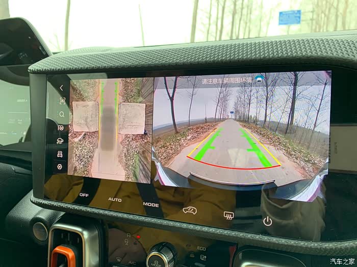 一路走的都是单行道,而且中间时不时的都会出现这样的限宽路障,这个路障还不像平时走县道乡道的那种比较宽的,大家看看副驾拍摄的360全景影像照片就知道了,等于说大狗就是贴着边过去的,因为大狗造型的原因,如果我没看这个影像的话我绝对是不敢走的……这次也顺便让我知道了影像里的黄线就代表大狗最宽的边缘,绿色的是轮胎位置,我估计现在已经是极限了吧。