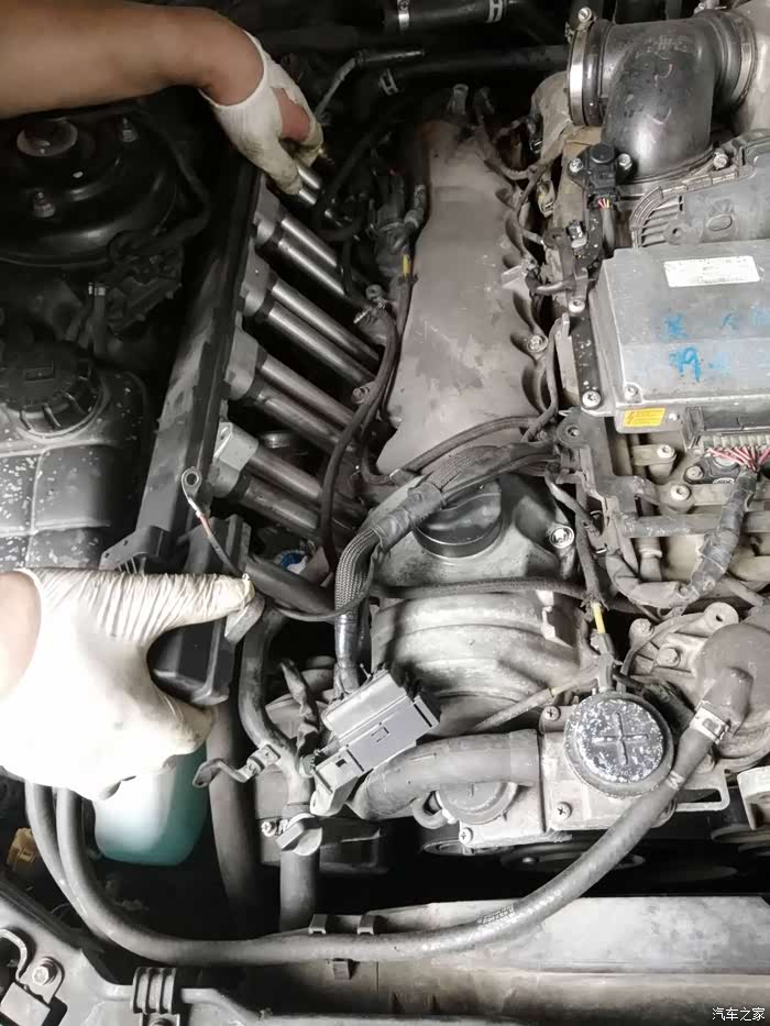 点火线圈是整排的,在侧面,慢慢抽出来。这货在SSSS的价格是3万,坏一个头整排换。我之前换的是原厂下线件,5000多。