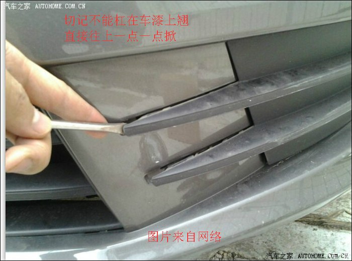 接下来拆雾灯位置的塑料板,直接用一个十字螺丝刀往上翘,因为原雾灯框上的塑料板是直接扣在上面的,没螺丝;但是切记不能直接杠在车漆上,我就是没经验,把2边的车漆杠掉不少,哎,心痛啊。(此图片来自网络)