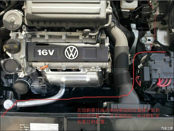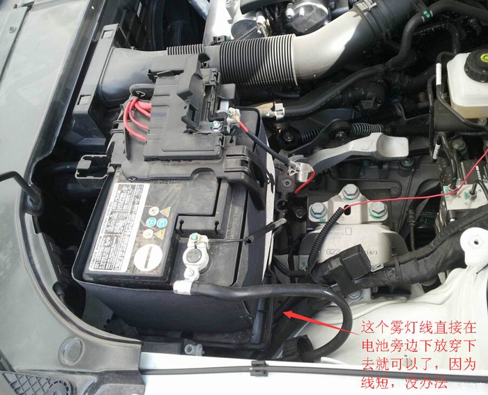 看一下左雾灯(面对车头)的走线,雾灯线从电池旁边经过直接下放到发动机防护板上,从下面经过,可以轻松穿到雾灯的位置,刚好。(我试了几次,只有这样走才刚好够长)