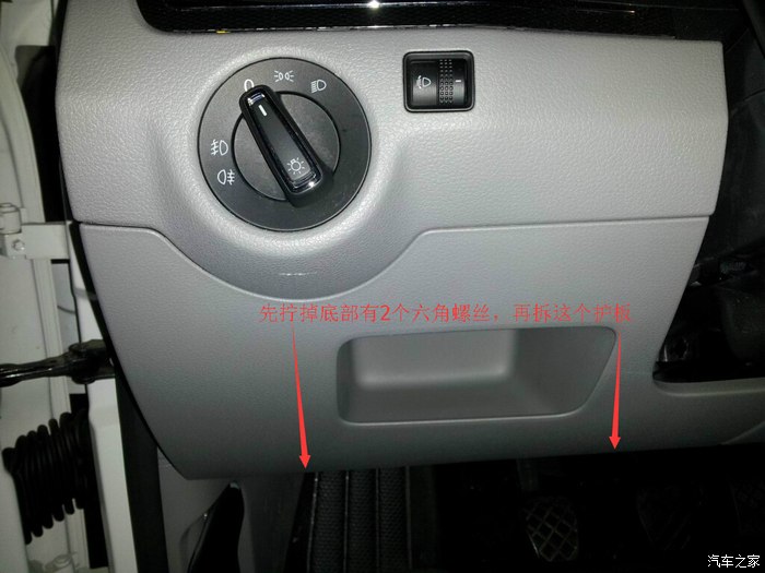 接下来拆大灯开关上的塑料护板,不然不好走线;注意在它的底部有2个六角螺丝,一定要先拧掉螺丝,再拆塑料板。(拆塑料板的时候慢一点,注意看下它的卡位,就知道怎么装回去了)