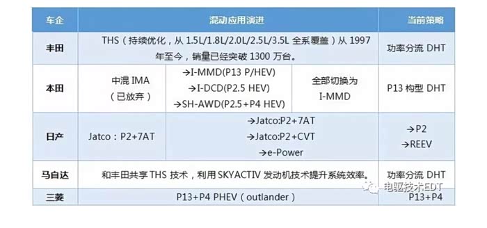 这几张图表清晰表述了PS功率分流构型混动(丰田和通用为原创代表),串并联(P13)构型混动(本田为原创代表,实际和比亚迪一样都是参考了美国人90年代的专利技术)之间本质区别,以及各自的应用企业,真正用增程式混动的合资企业目前其实只有日产汽车