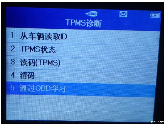 (1)将TS601与车辆连接好,进入“胎压系统诊断-通过OBD学习”;