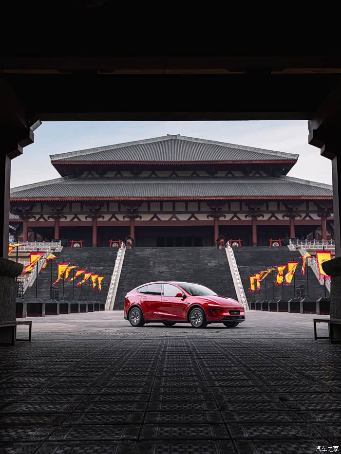 2、转到侧方时,把车贴在古建廊檐下,让飞檐线条顺着车身走,用建筑层次衬出车身流线。