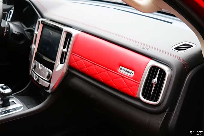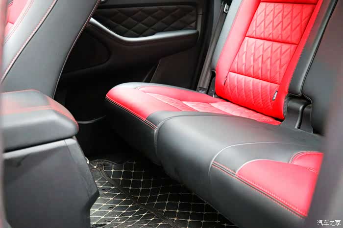 红黑的内饰搭配,看起来色彩不单调,用料也很奢华,大面积的皮革包裹,还有菱形的缝制图案,内饰满满的豪华感。