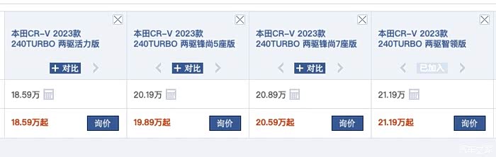 28号CR-V发布了新款1.5T燃油车的车型,价格有一点超出人们的预期,虽然号称是最好看的一代CR-V,但是丐版入门就要18万多,落地得20朝上,实在是有点不能接受,按照本田一贯的尿性,最低配的入门版,就是拉低门槛用的,再加上1.5T+CVT,这套老旧的动力总和,不知道是不是本田开始飘了。