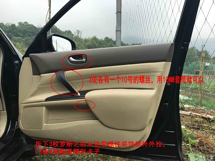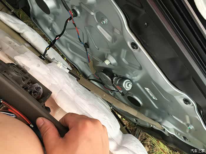 门板卸下时要先断开玻璃升降器开关,方法:在门板卡子拆好后,180度旋转门板(上下翻转)用1字螺丝刀顶出个开关接口,门灯1处,升降开关3处。(顶开关时要小心别划伤自己)