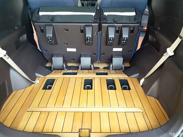 三排座椅掀起来后置物空间更大,三排座椅也可以改装成沙发床或者航空座椅。