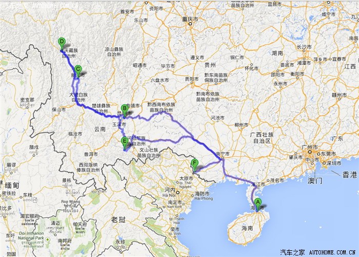 云南自驾路线图:海口-南宁-百色-九乡-昆明-楚雄-大理-丽江-千龟山-香格里拉-松赞林寺-德钦东竹林寺-丽江-虎跳峡-剑川-大理-玉溪-元阳梯田-红河-富宁-百色-凭祥-海口。
