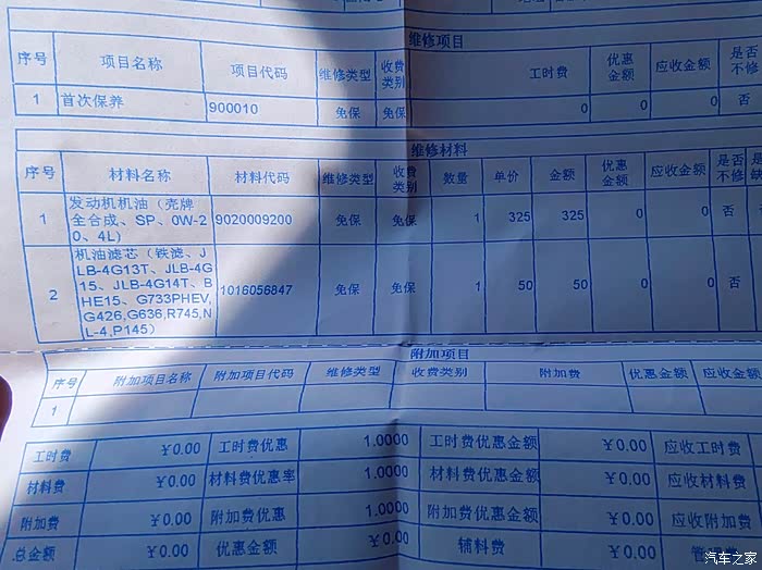 因为是首保,需要去更换或者说保养的项目较少,主要是更换发动机油及机油滤清器。当时去的时候工作人员有推荐除油膜的还是打蜡的项目,记不太清楚了,需要自费,我说不需要之后就没有做,只做了免费的项目。