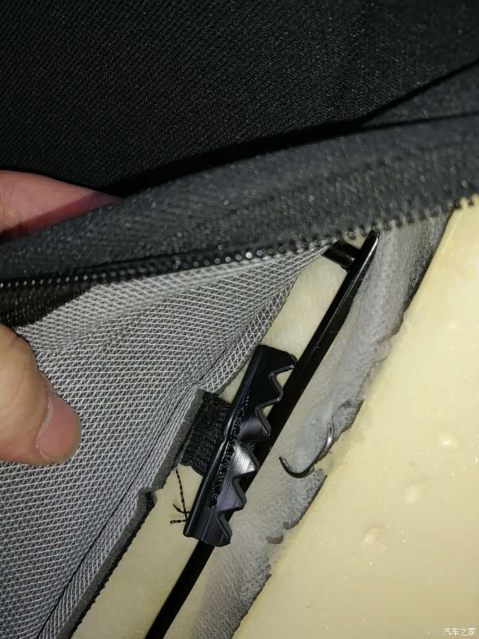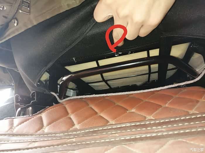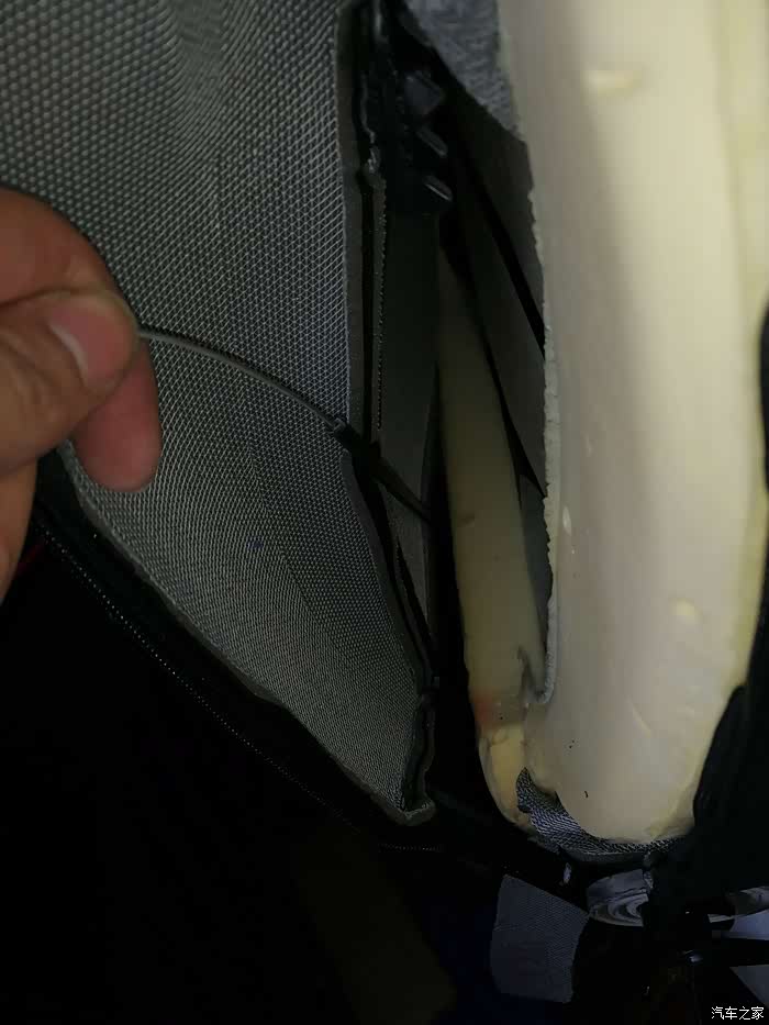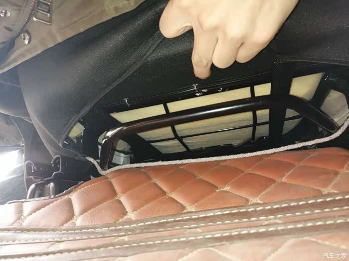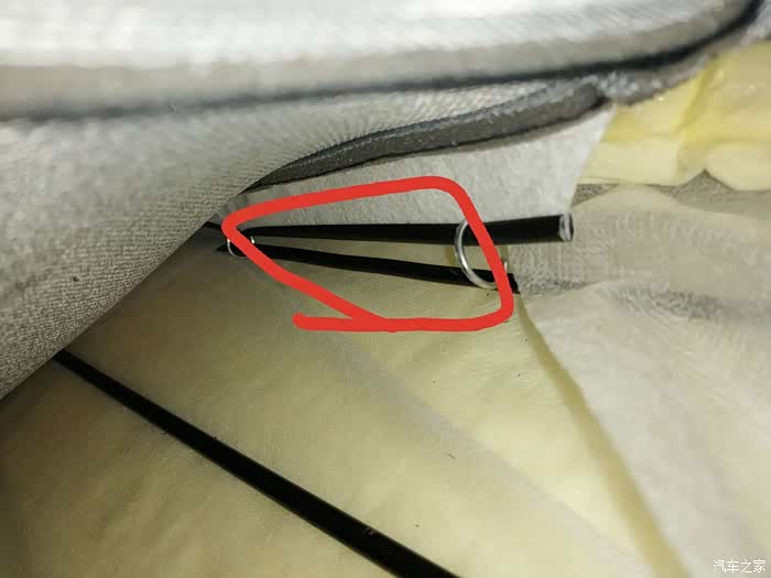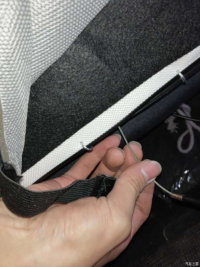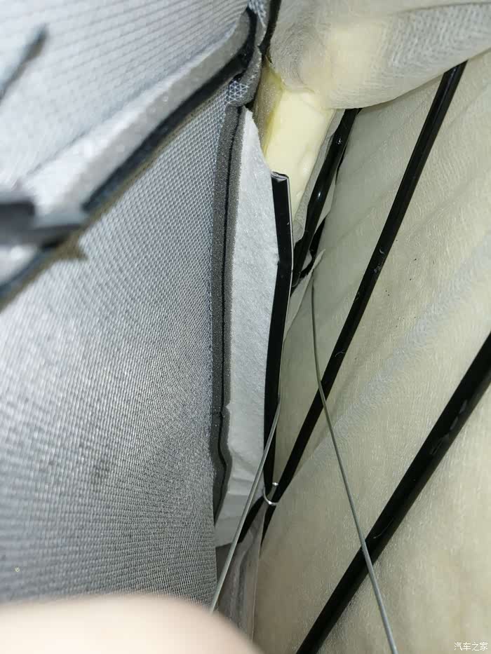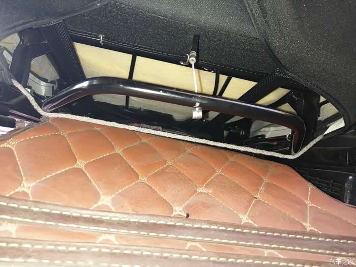 做完后由于座椅后面这里会勒到海绵,所以我垫了块硬纸板,主要是防止勒坏海绵,同时对钢丝松紧进行调校,反复测试增减纸板厚度达到放倒前后移动刚好没声音的地步