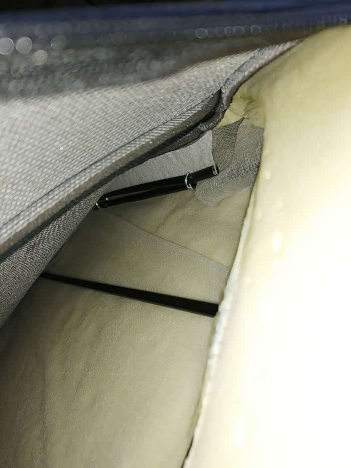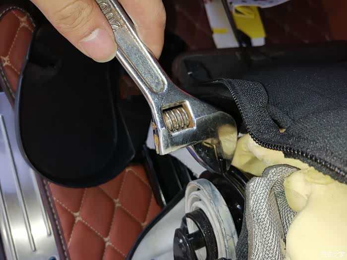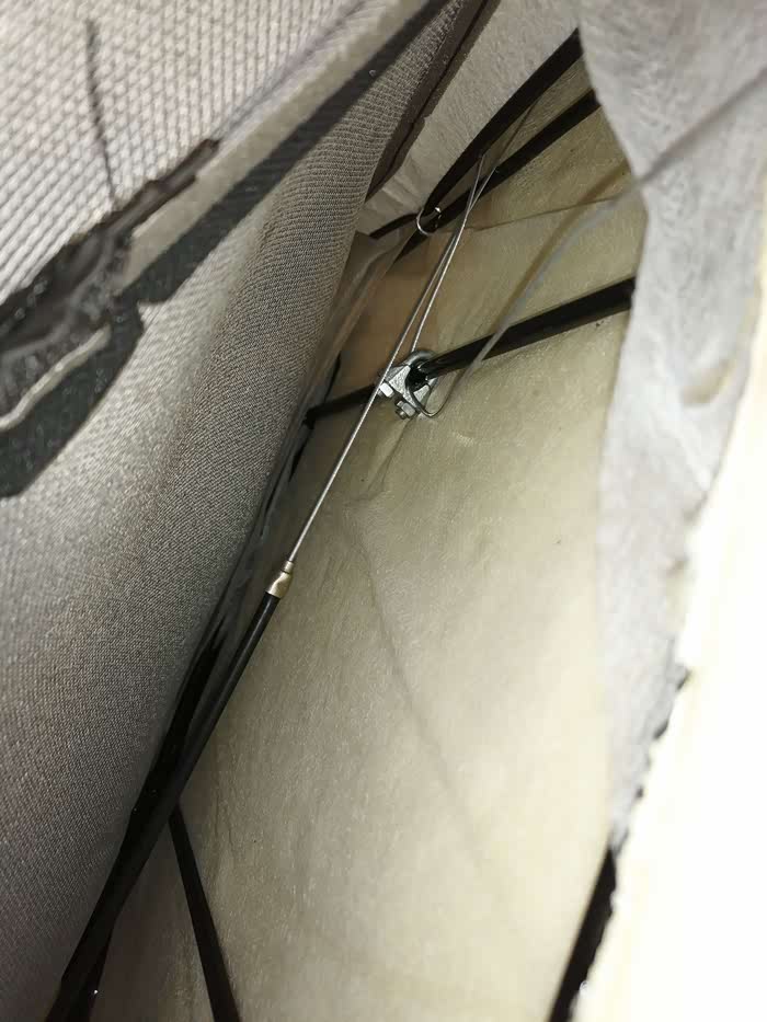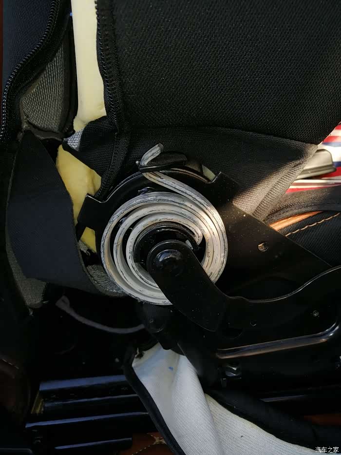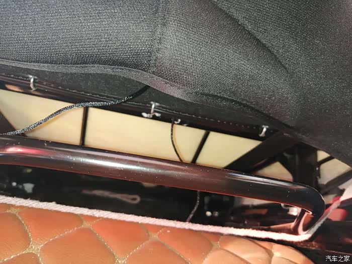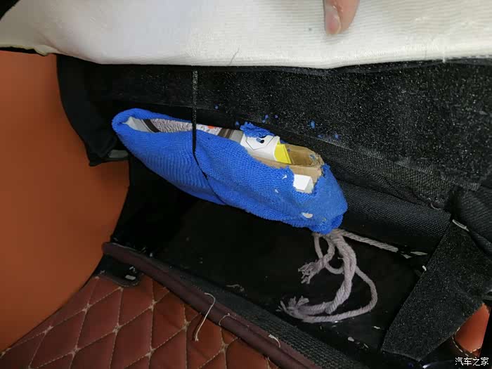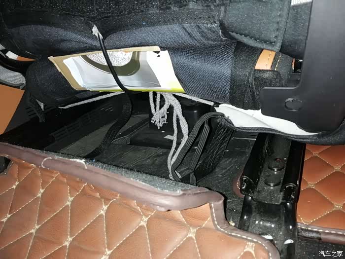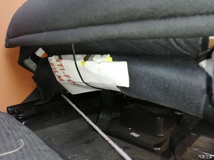做完后由于座椅后面这里会勒到海绵,所以我垫了块硬纸板,主要是防止勒坏海绵,同时对钢丝松紧进行调校,反复测试增减纸板厚度达到放倒前后移动刚好没声音的地步