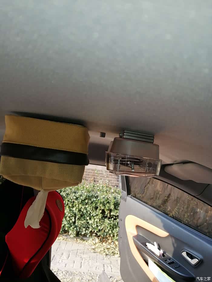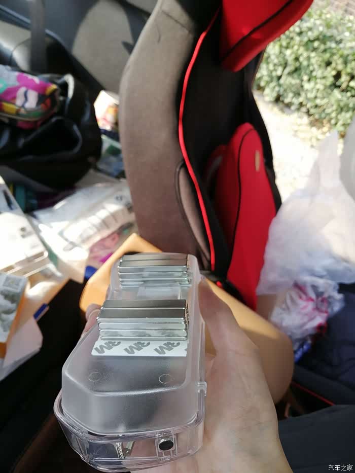 然后把这里扒开直接把铁板塞了进去,用磁铁在下面吸着它到中间,就能把纸抽盒和墨镜盒吸在顶上了。如果不嫌麻烦可以把顶子拆下来把铁板找好位置粘上去。
