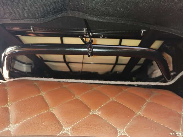 在前面座椅下方有一个包在海绵里面的横杆,需要用剪刀在上面打个眼,然后把绳子从打的眼中穿过去搭在横杆上就可以了