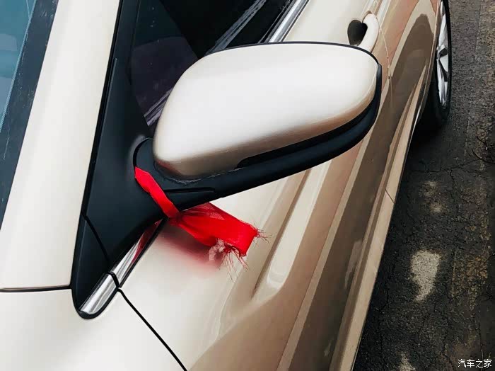 后视镜上还有买车的时候给拴的红绳、哈哈