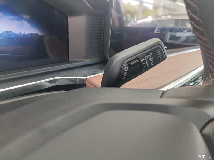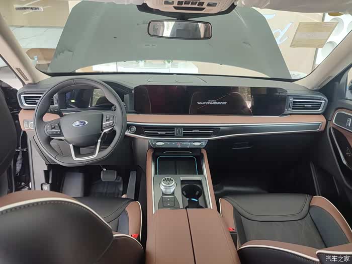之前在网上看的探险者内饰图片是酒红色的,感觉很豪华,展车摆了辆棕黑的配色,又是不一样的风格。当然,内饰的重点还是在大屏上,27英寸的大屏同级罕见,一上车就特别抓人眼球。通电后,车机界面也是非常漂亮,功能布局简约,操作简单容易上手,触控反应还很快,用着特别流畅。这块27英寸的大屏显示方式很多变,可以一分为二,开车时一边显示导航一边用来播放视频完全没影响,可玩性是真强。