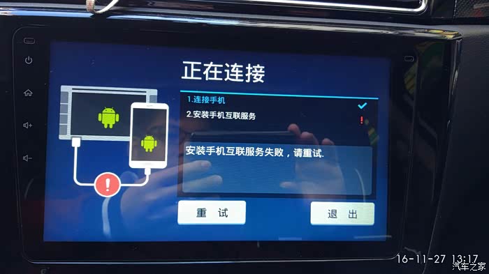 过一会手机就会弹出安装互联助手的通知,如果没有弹出或者,中控台显示连接失败我们就需要,多次拔插数据线。
