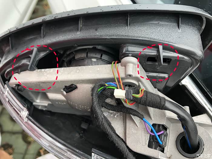 后视镜壳主要由两个卡扣固定,在图中也可以看到,把后视镜调节到最下即可用翘棒拨开卡扣,切勿直接徒手扳下来。卡扣翘松后轻轻一搬壳就很轻松拆下。(同事的神车不小心被我拍了下来,哈哈)
