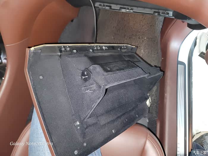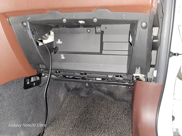 2、拆手套箱。这个其实也挺容易。首先打开手套箱,只开到两个手指的角度,然后托底部向上抬,因为底部有三个挂钩,使其脱离,这时候看到右边的卡扣往左用点劲,也使其脱离那个孔,那此时只剩下左边的卡扣,再轻轻向右使劲就整个拿下来了。