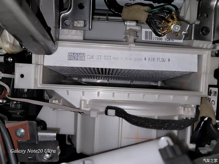 7、安装上新的空调滤芯。此时注意箭头向下。其二空调滤芯下面有支撑板,安装的时候一定注意。如果装上的滤芯不是悬空的,则说明支撑板插到滤芯的缝隙里了,重新安装,直至是悬空的位置。