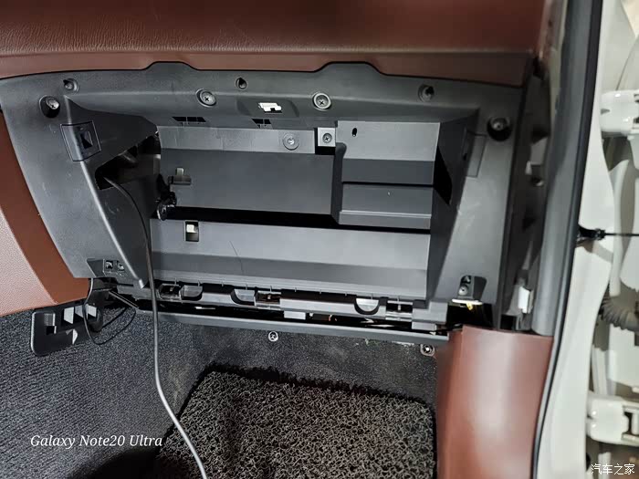 3、拆阻尼线。也可不拆放在上面。非常简单,就一个固定圏和一个固定的圆孔,轻轻一拿就下来,这样手套箱就可以整个拿下来,放在一边。