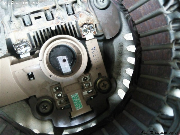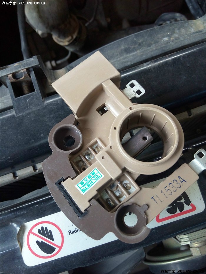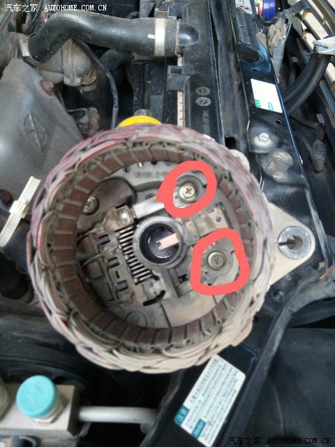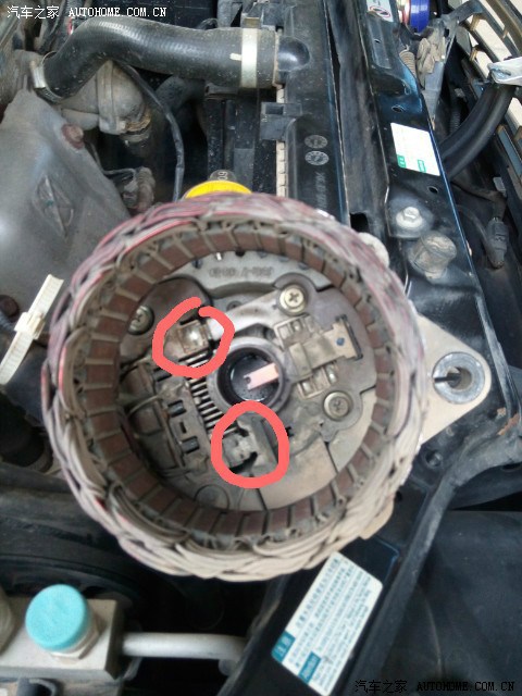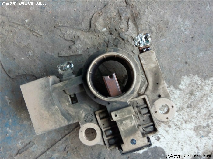 前段时间发现ABS灯和手刹灯异常亮起,发过一贴求助,没有解决!后来经观察发现熄火时所有灯正常; 转速低于800时,正常; 加速时又会亮起来;室内灯比以前明亮; 还发现电瓶透气孔处有少量电瓶液溅出; 结合逛论坛所得,判断鉴定为发电机充电过大, 决定换发电机调节器. 感谢车友: 欧阳雄2008 的帖子http://club.autohome.com.cn/bbs/thread-c-407-23777755-1.html?type=jing&pvareaid=101796 上图