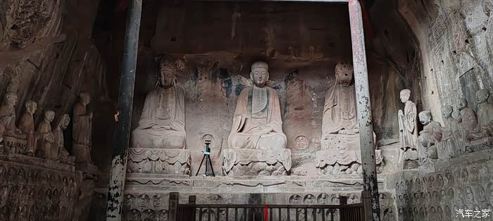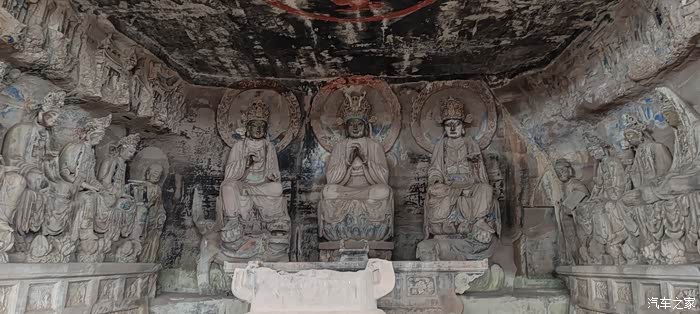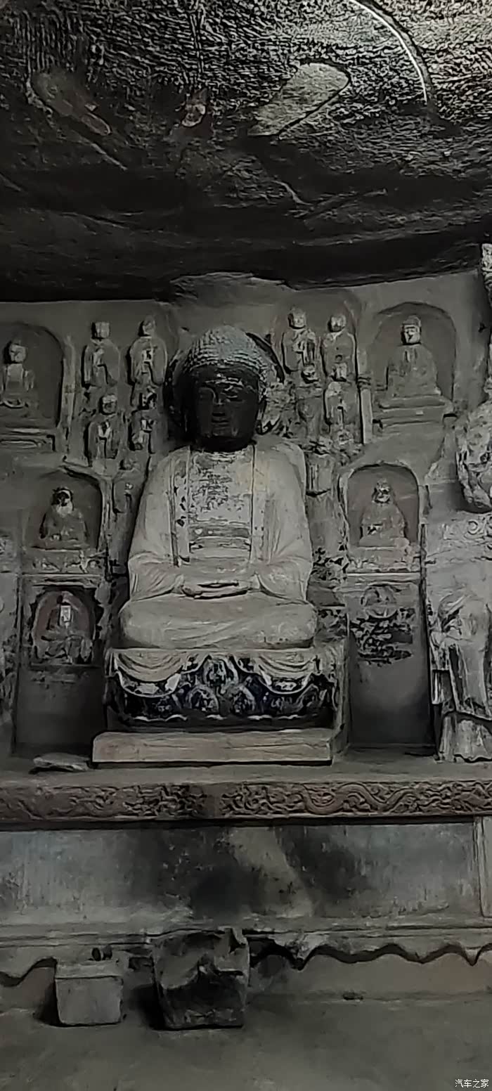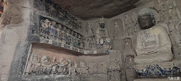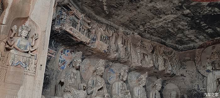 窟内上部空中浮雕,亭台楼阁精美,人物造型复杂,下部十数遵座像造像发冠精致,人物神态安祥,观之令人肃穆,心静平和!