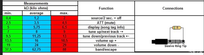 这个是老外测的,也可以自己用5V电压加一个100k的电位器到方控的两根线上,电位器调整1k,测试一次,看主机有啥反应,这样可以测出来所有阻值的定义。