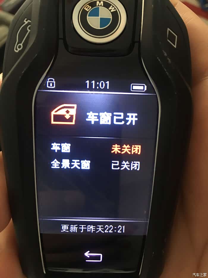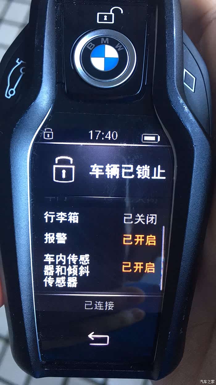 这个问题是我发现的,就是每次我解锁上车后,车子偶尔会出现一声很明显的,像是加紧卡钳的声音,“菊”~的一声,遇到过几次后,我特意注意了一下,啥情况,这种触发情况是我坐上车以后,没有按动任何按键也没有把手放在方向盘,就乖乖坐在驾驶室椅子上的时候(因为我上车第一件事情是戴眼镜),那个声音还比较大,后来我问了几个朋友,包括宝马的技师,给我的答复是,当车子未启动时,车子有防倾斜报警(防止你的车子被别人用吊车直接吊走)检测到车子有震动后,会自动夹紧卡钳,当然,也有可能是自检的声音,,,,我擦,,,感情是我车子停的地方不平,有倾斜,还是我太胖了,,,,,,(下图有液晶钥匙显示的倾斜报警器)