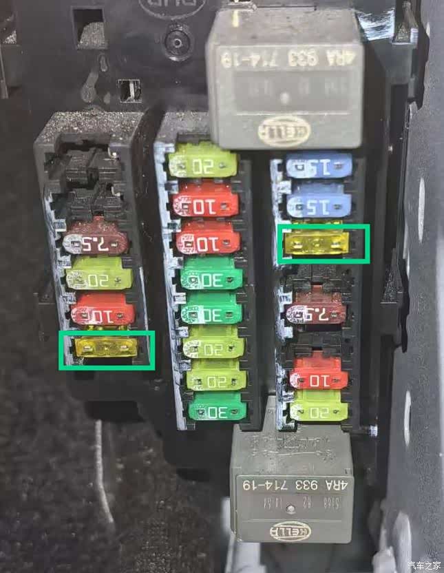 保险盒需要更换的两个保险丝(红框标识)