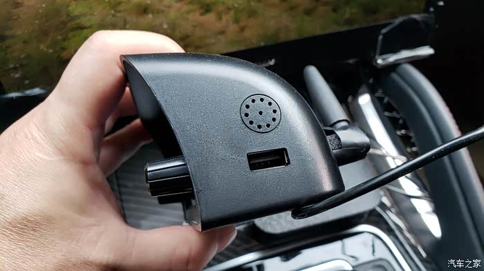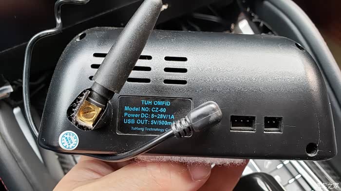 这款设备可以用保险盒接电,也可以用12v插头,我用的是12v。至于安装位置,就在中控大屏幕后面的平台上。虽然大屏幕的上沿高出平台少许,但正好不会遮挡显示面板。