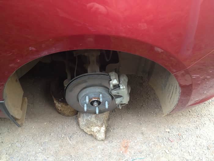 唯一欣慰的是1、轮胎下用石头和木头垫了下;2、5个螺帽没有丢掉,就在旁边找到了。