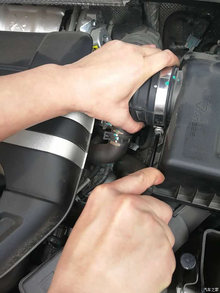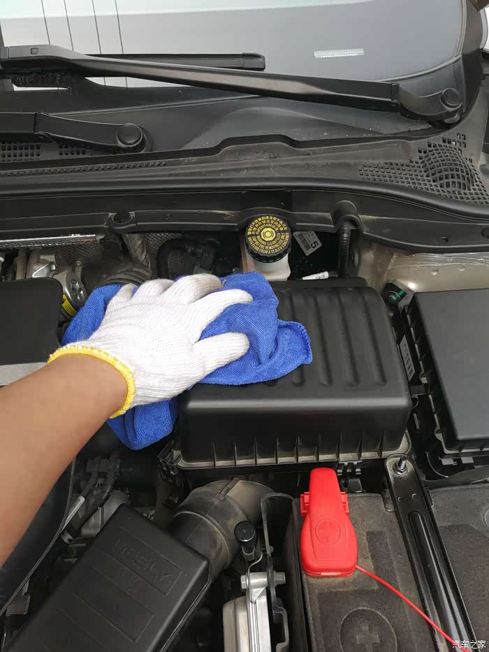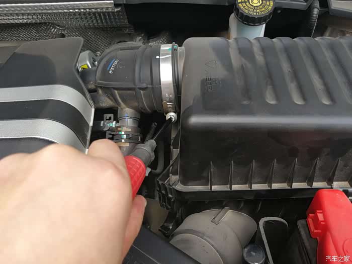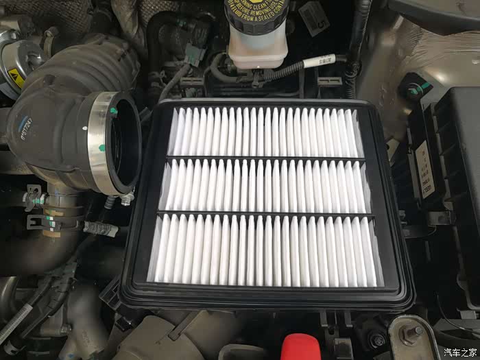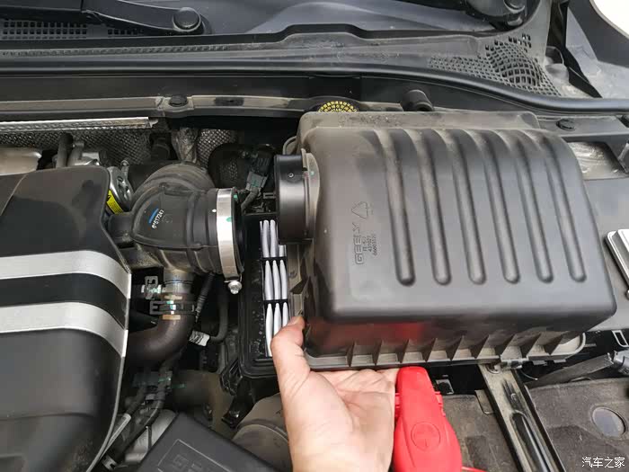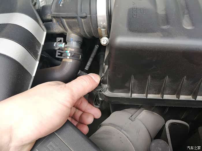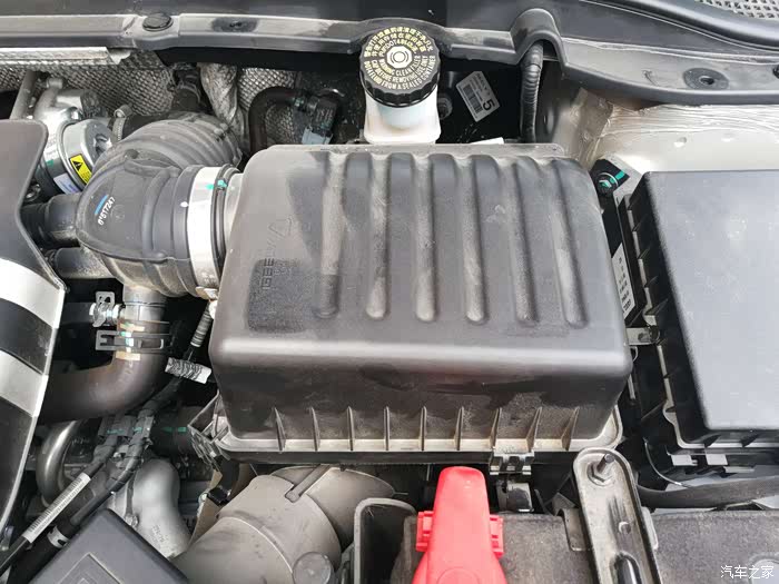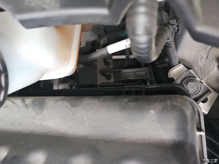 第二步、打开机盖之后,寻找到滤芯的位置,找到进气管就找到了滤芯。滤芯在电瓶下面一点的位置,就是下图中黑盖子下面就是,想要拿出滤芯,还得把这个黑盖子去掉,四个角都有卡扣,松掉就可以把盖子拿掉了。需要注意的是,拆的时候一定要小心。