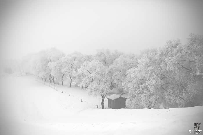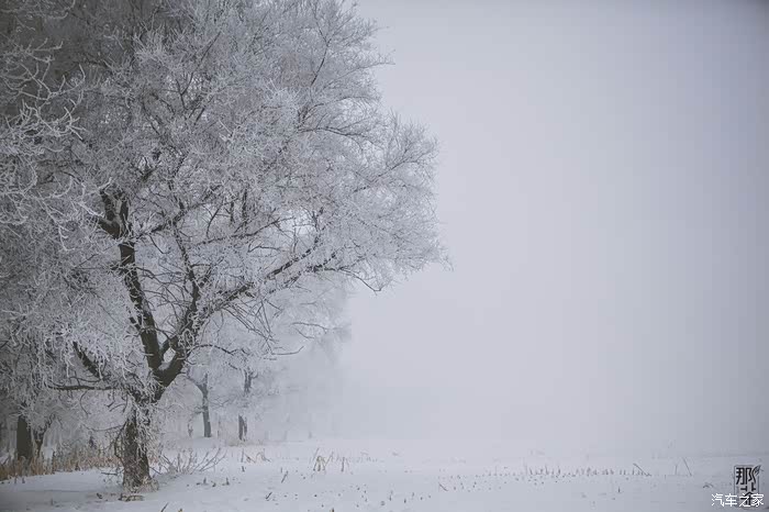 将近11点了,雾气还是没有散去的迹象,看来昨晚的雾气发力过猛,导致今天迟迟不肯散去。那也没办法,大自然的美景大自然说了算,老板随后还带我们去了一个他自己找的小众景点,雾凇更多更壮阔,就是缺少了蓝天。