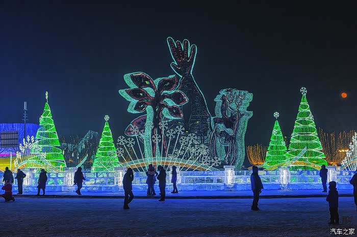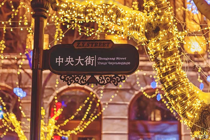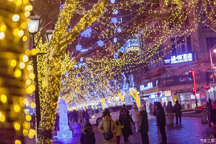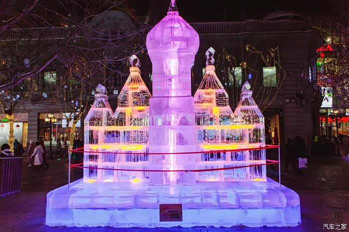 吃完饭出门,天已黑,中央大街华灯初上,晚上的中央大街在彩灯的映射下更具魅力,仿佛变了一个样子,在东北很多景点白天和晚上的感觉往往差很多,晚上各种灯光秀,后面的雪乡也是如此。所以蛮多景点你白天来过之后,晚上再来又是另外一种景致了。边走边看,头上是彩灯,路边也是,还有摆放在两旁的冰雕也有灯光效果,真的很美。