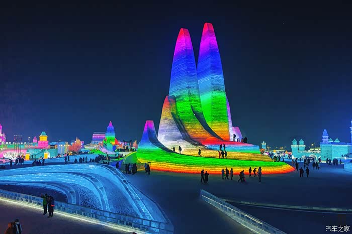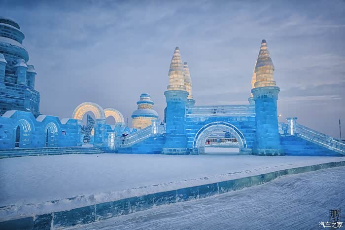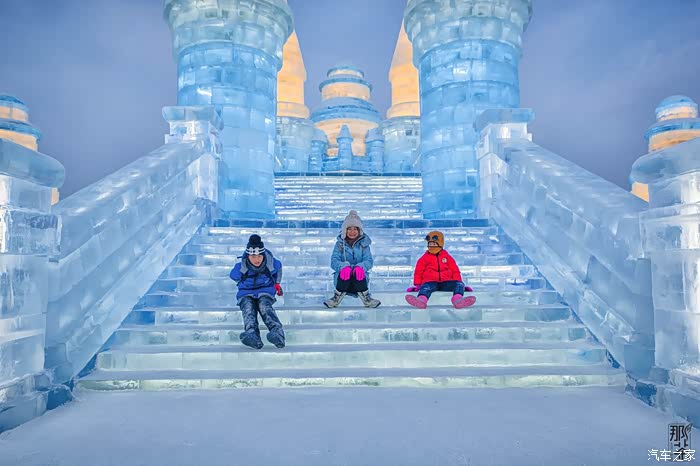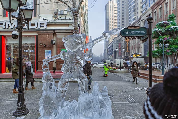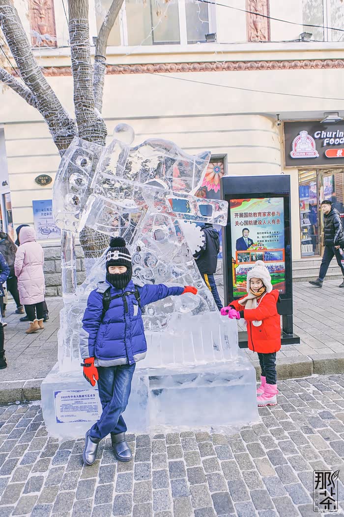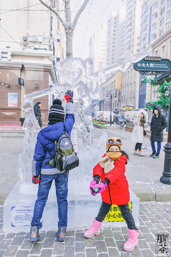 大街两边隔了几米就放置了一座冰雕,透明光滑的冰雕引的两位小朋友每每停下来摸上几把,恨不得要挖一块走似的。
