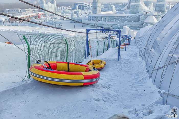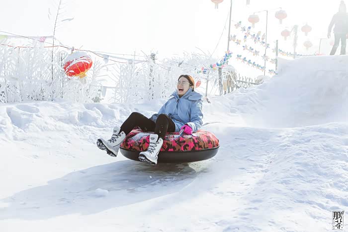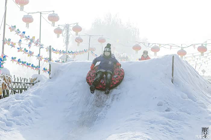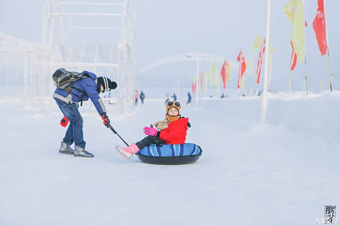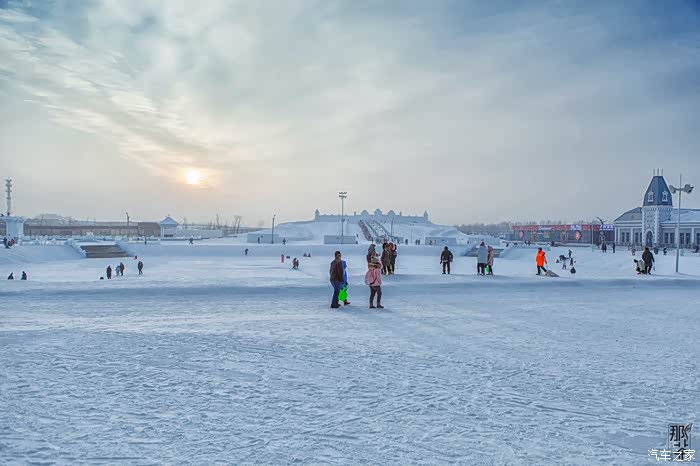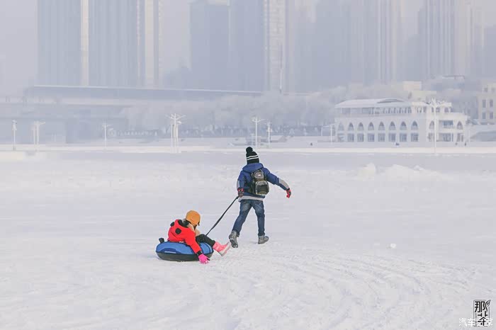 一直沿着中央大街走到尽头就是松花江了,如今的松花江已经冻上了厚厚的冰层,游客、马车、汽车在上面跑都完全没问题。当地业者还在上面办了一个冰雪游乐场,各个商户都划开各自的场地经营着自己的收费游乐项目,我们花60租了一个雪圈,一个人坐一个人拖,也很是好玩。越往江心走人越少,在冰雪皑皑的世界里,我们这几个南方人玩的分外开心。