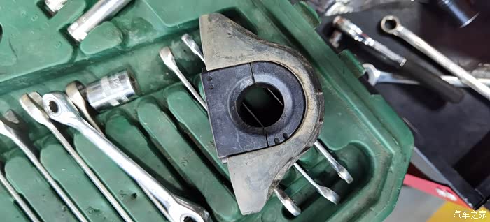 可是,开了一段时间才发现,右前的咯噔异响还是原滋原味,一点没变。偶然间在B站看到up主说异响可能是平衡杆胶套老化造成,我就定了德某顿的F49前平衡杆胶套100块,再次来到天猫养车,这次办了会员,一般的车换胶套是100工时费,这个车要拆元宝梁才能换,所以工时费200。接下来的事,大家一定注意避雷了,F49千万不要换平衡杆胶套,这个胶套是粘在杆上的,起到限位作用。我要求天猫小哥强行拆了原厂胶套(没有损坏痕迹),换了新买的副厂胶套,但是我们没有胶水,咨询卖家某斯顿答复不用上胶水,导致现在平衡杆往左位移大约3公分,现在已经磨到羊角了,交学费了。
