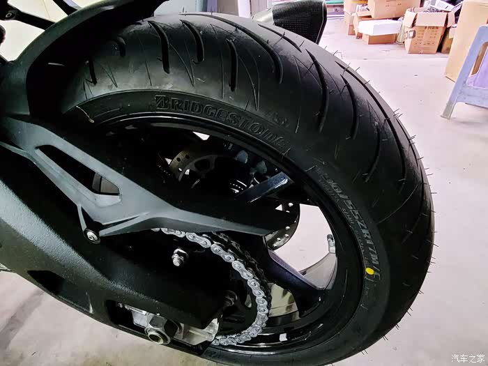 轮胎还挺宽。原厂配的布里斯通。这两个礼拜骑着感觉抓地很不错。