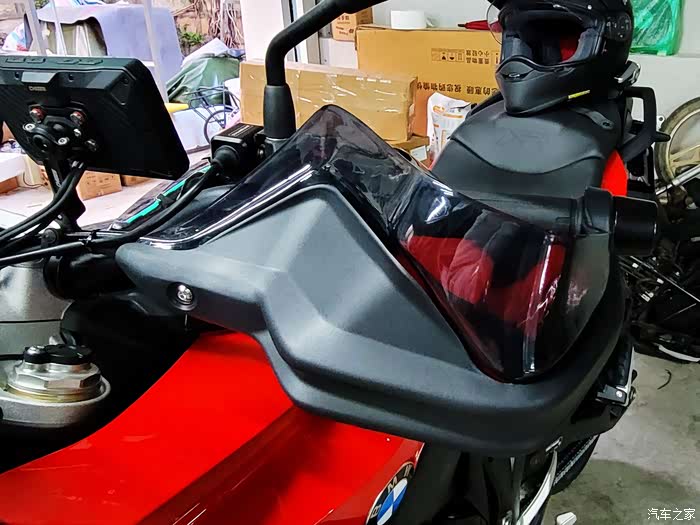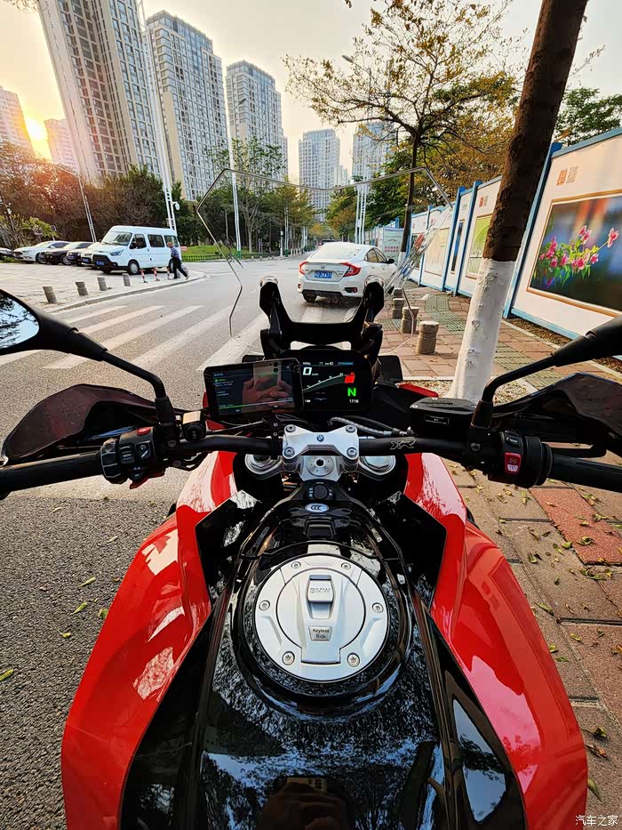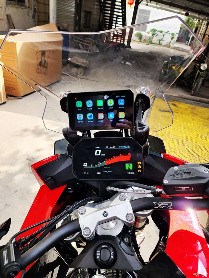 未完全体。当时刚提车两天。装了AIO-5车机。这也是专门为摩托生成的可选的唯一车机类产品。如果我说的不对请随时更正我。反正目前为止我还没发现其他品牌的摩托车车机。可惜因为新产品,有点拉跨。装上后发现GPS芯片有问题,搜星能力弱,不稳,官方售后专门推送了一版系统,升级完发现老样子。无奈只能换主机。当时暂时安装在这里,然后那时还没装箱子,因为箱子的顶板拿去改色了。定速巡航也还没加装。
