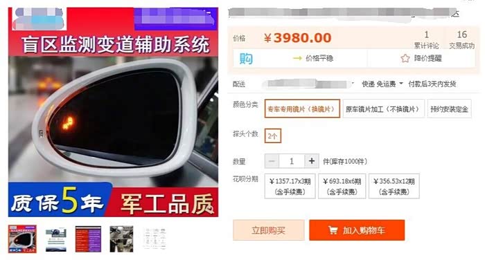 详细说说这些东西干嘛的,总成是必须的350大洋,功能什么和原装没区别,视频为证。支架37大洋,支架是什么,基本上加装并线辅助,都得在车体上用电钻打孔,这个估计没几个车友受得了~但是H4本身是预留了雷达安装位置,所以也有原厂专用支架,这样就不需要安装的时候电钻打孔,破坏车体了,这个支架直接联系4S订购就行,上面的型号都已提供,童叟无欺~灯1.3*2大洋~这东西是选配,主要是我嫌弃总成配的灯不够亮,而且颜色不喜欢~算起来成本不到400元~看看某宝的价格