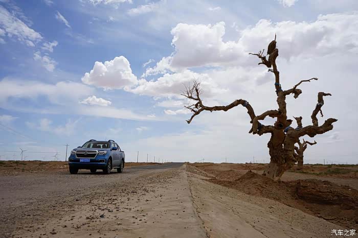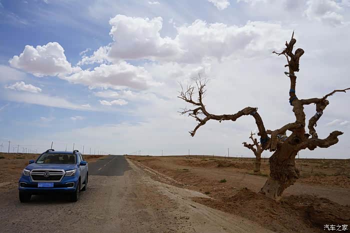 沿着柏油路行驶150公里左右,就会看到一颗仿佛盘龙一般的枯树,仿佛地标一样伫立在苍茫的戈壁滩上,而随之而来的柏油路也消失了。