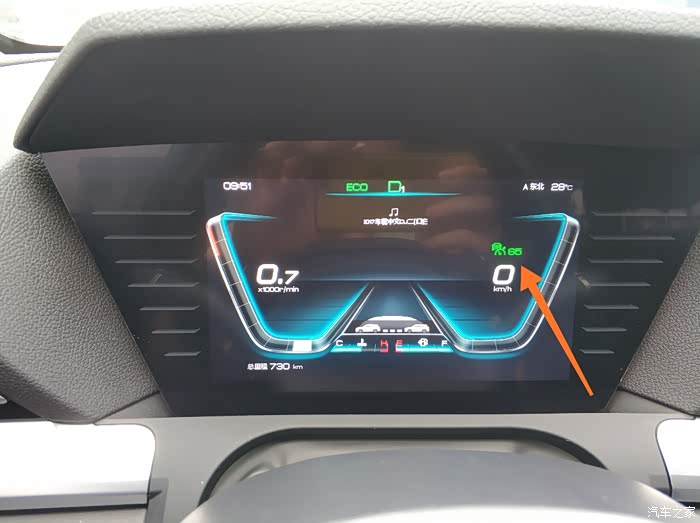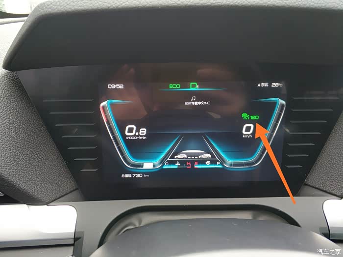 向上推一下,仪表盘会显示当前最高巡航速度的提示(箭头指向的位置为速度提示,单位是km/h)