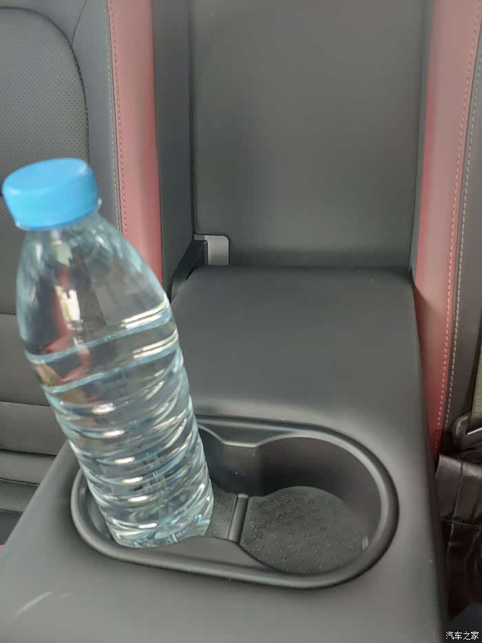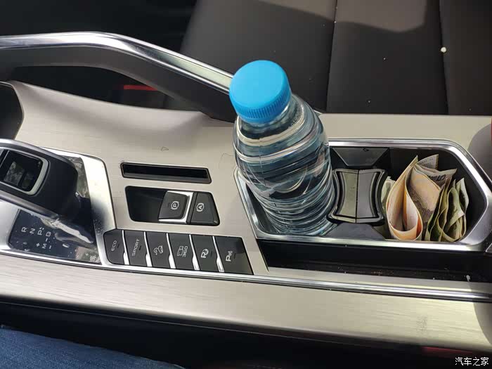 先看中控台。两个杯架。放矿泉水跟饮料是没两个是没有问题的。两个杯架之间有阻尼块。可以根据你放的水杯大小卡着禁止晃动。挺好。电子手刹旁边有卡槽。可以放加油卡。告诉通行卡之类的卡片。杯架旁边的方形槽可以放手机。
