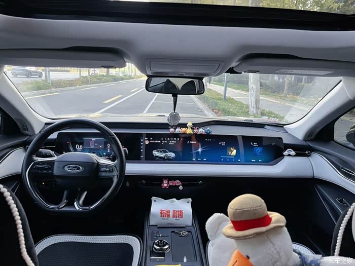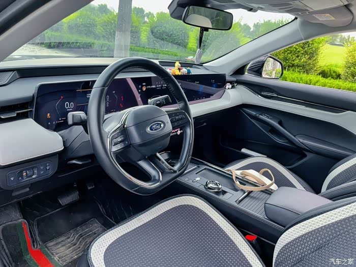 映入眼帘的是27寸的大连屏,充满着科技感,屏内分辨率高,显示内容丰富,中控台的设计简洁明了,大尺寸的液晶显示屏集成了多种功能,操作起来非常方便。不管你是想唱歌,还是导航,都可以语音呼叫,你好:“福特”,那么车机也会轻松应对你的各种问题。