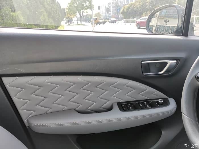 车内大多是塑料材质,符合他主攻性价比小车的定位,塑料都做了纹理,门板上有部分皮质。