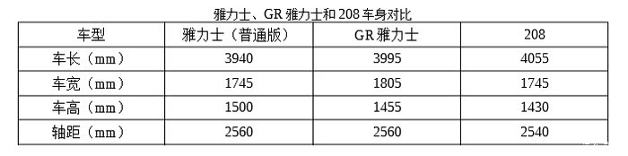 GR雅力士车身尺寸相比普通版做了调整,搭载由M15A 的扩缸而来的G16E-GTS 1.6升直列三缸涡轮增压发动机,这台发动机是丰田根据WRC赛事经验开发的,最大功率261马力(192kw)/6500rpm,峰值扭矩360 N·m/3000-4600rpm(日本版最大272马力,峰值扭矩370N·m),是目前业界输出最高的1.6L三缸涡轮增压发动机;匹配6速手动变速箱,空重1280kg,百公里加速5.5秒,极速230公里/小时,综合路况驾驶油耗百公里7.7升。英国起售价29995英镑,法国起售价35600欧元,德国起售价33200欧元。