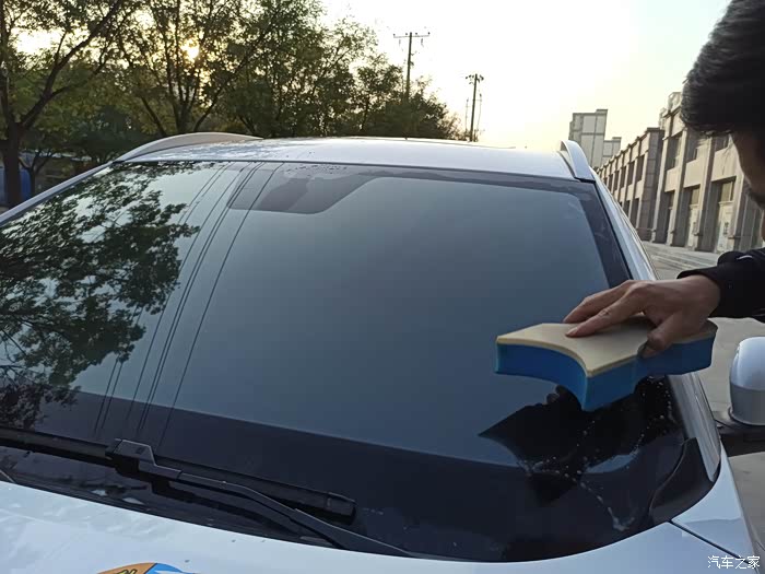 用了一块我们之家兑换的洗车泡沫将玻璃上的油膏擦抹掉。