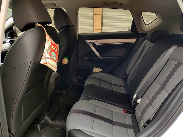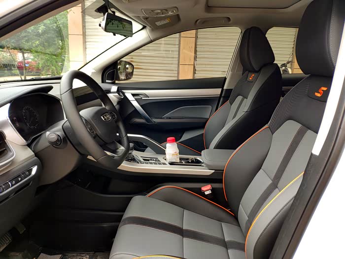 座椅内饰颜色是普通的灰黑色,好在银色的面板和橘色的线条和刺绣点缀装饰了一下,整体色调也就没有那么单调了