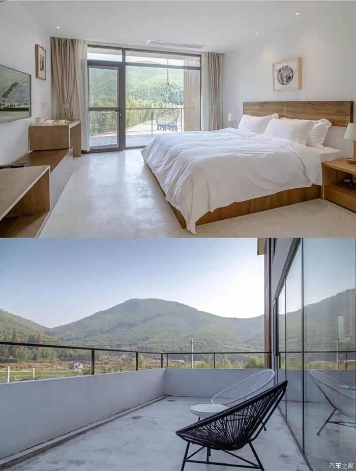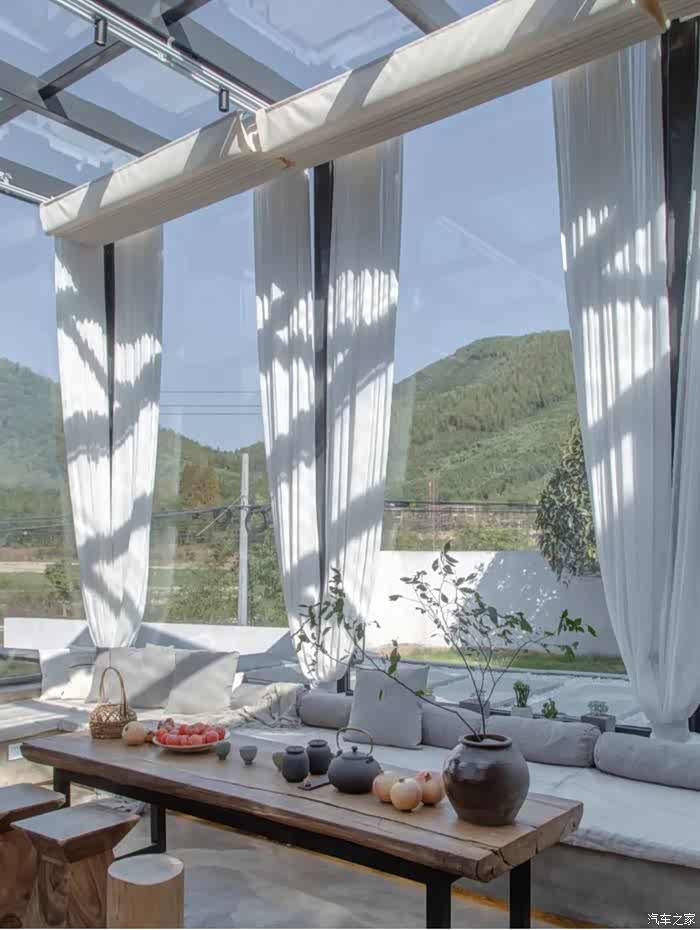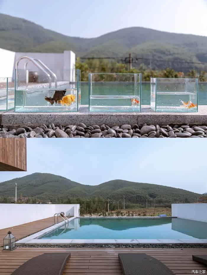 鱼缸的建筑风格,属于北欧极简风,简单的线条、白墙与几何状墙体结构相碰撞错综复杂,仿佛走迷宫一般,下一个转角便是惊喜。从圆形墙洞穿过看到的却是一方静水池,坐在静水台上,透过方形的墙体望去,满眼青翠的竹海,定格成了一幅美丽的山水画。他们家的C位便是270度全透明落地玻璃环绕的阳光房,拍照超好看。你可以坐在沙发上看看书吃吃下午茶,看看玻璃房外的山景,怎么都不会无聊。他们家还设有露天游泳池,超级可爱,池边摆了一些小鱼缸和小金鱼,一起陪你在莫干山竹海间游泳。 室内有Ktv系统,多功能影音娱乐厅,调酒吧,棋牌,阳光房免费茶室,露天无边泳池,二楼超大露台可以烧烤办各种party,并且还有一只会唱歌的网红狗,等你来撩~室外有忘忧花园(植物园看萱草,动物园看 梅花鹿孔雀)、绿乐园(儿童玩乐区,小型足 球,蹦床,秋千)、边上就是茶园(夏天看萤火虫)、门口有清澈小溪(捉虾捞鱼)、田里面(钓龙虾,抓黄鳝泥鳅,还可以拿来做菜)体验不一样的山野时光。